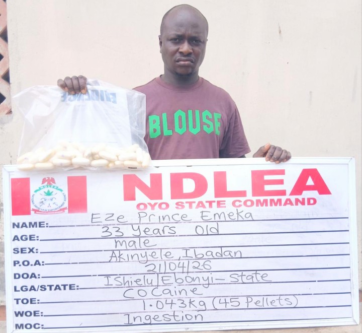 The suspect who claims to be a businessman in Sokoto was subsequently placed under close excretion observation during which he excreted a total of forty-five (45) pellets of cocaine with a total weight of 1.043kgs in three excretions.